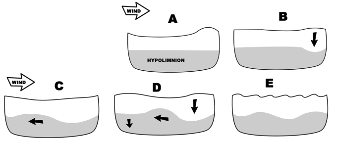 On large lakes, if the wind blows in the same direction for long enough, the surface water will want to head toward the downwind side of the lake (A in figure below). When it gets there, it can’t just hang out. Gravity wants the surface of the lake to be flat, so the water falls into the lake. This creates an abundance of the warmer surface water at the downwind end. The hypolimnion is compressed to make room for the warm water (B in figure). Of course that cold water in the hypolimnion needs somewhere to go also! Conveniently, the warm surface water just left the upwind end of the lake. That means that there’s some elbow room at that end. Now the hypolimnion is leaning toward the upwind end of the lake (C in figure).